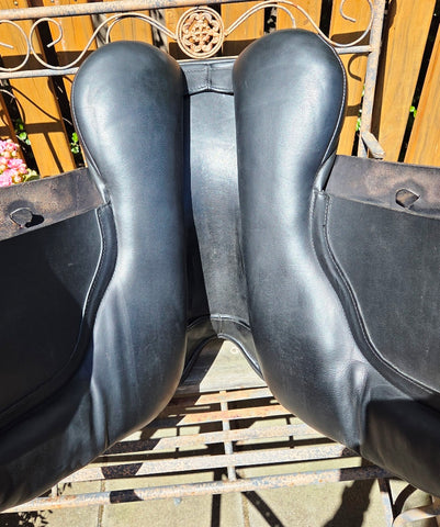 Almost NEW in condition 17.5" Ideal Suzannah Dressage saddle, wide gullet, wide channel. Black in colour. Large knee blocks with pre-shaped flaps that sit neatly over the block. It has a broad channel, wide dropped panel and cut back pommel. Comes with 7 day trial. Can be viewed at Pakenham in Vic.